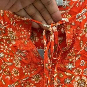 Chic sleeveless blouse with floral design. Perfect for any occasion. Red orange