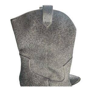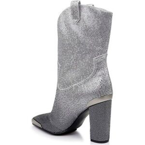 Get ready to sparkle in the JOHNNY GUITAR SILVER boot - named after a movie that beautifully captures the western Hollywood aesthetic. Featuring an ombre rhinestone design, western accents, and a comfortable block heel, this boot is perfect for making a statement. Plus, with a gripped sole and extra padding, you'll be dancing all night in comfort.
