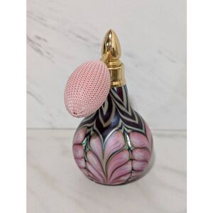 The product is a rare and collectible 1991 Daniel Lotton signed swirled iridescent pink, dark blue and a hint of green, blown art glass perfume atomizer. Handmade in the United States, this family studio is located in Illinois. This unique piece is a stunning addition to any decorative glass or perfume collection. Featuring intricate swirls and iridescent colors, this atomizer is not only functional for spraying perfume but also a beautiful and artistic display piece for any vanity or dressing table. Then Lotton family glass has been a desirable addition to many collectors and museums!
