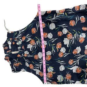 High smocked collar with button closure. Sheer and lined. Dark blue with tulip floral pattern.