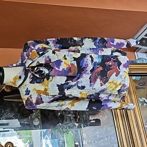 100% Silk multicolored brush stroke print, buttons down the side of the bust and has a self tie scarf. Excellent pre-owned condition 21" inches across the bust 24" inches from shoulder to hem.