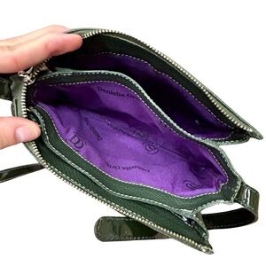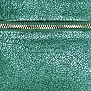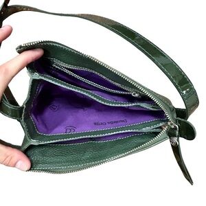 Elevate your everyday style with this luxe Daniella Ortiz crossbody bag in a rich forest green pebbled leather. Designed for function and fashion, this handbag features three separate zippered compartments and a vibrant purple suede interior with Daniella Ortiz branding throughout.