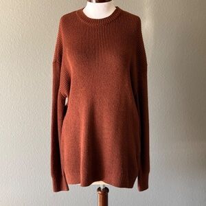 Upgrade your wardrobe with this stylish rust brown oversized knit sweater. Crafted from a comfortable and warm material, perfect for fall and winter seasons. Features a classic crew neckline and a relaxed, loose fit for effortless casual chic. a versatile piece that pairs beautifully with jeans, leggings, or skirts. Whether you're lounging at home or heading out for a casual day, this cozy sweater is a must-have.