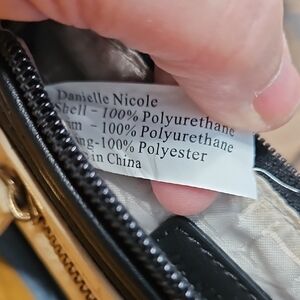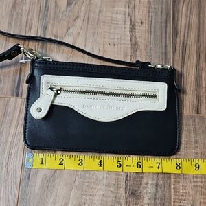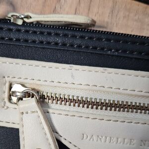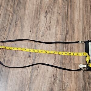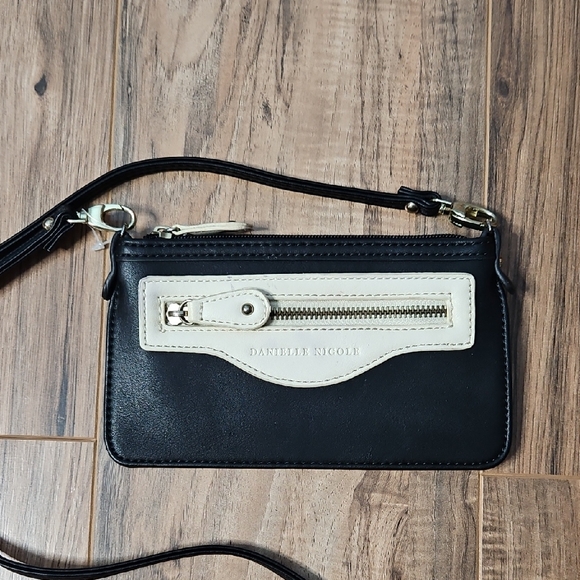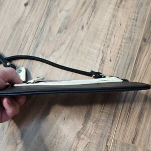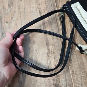 Elegant crossbody with a sleek black body and cream accents. Features a secure zip closure. Ideal for day or night outings. Has two small areas of flaws. One on front zipper area and the other is at one corner. Very minor flaws. Price reflects for tho. See above photos. (Cabinet)