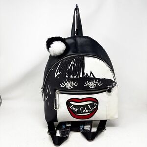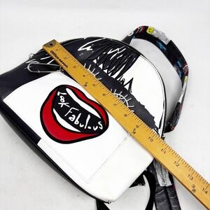 Details: Embroidered "Look Fabulous" lips, eye embroidery, safety pin zipper pull, faux fur pom-pom charm, printed adjustable straps