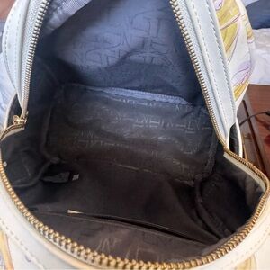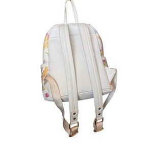 Charming mini backpack with a princess and floral design. Features a colorful print with pink, purple, and yellow accents.