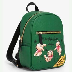 Don't say "Oh bother!" because you forgot something, keep everything important in this mini backpack! Inspired by Winnie the Pooh, the green backpack is printed with three pictures of Pooh and "A bother-free day..." Featuring adjustable shoulder straps, a top carrying handle, side pockets, a front zipper pocket, and top zipper closure.