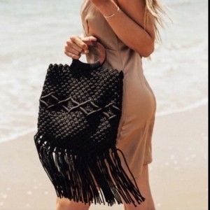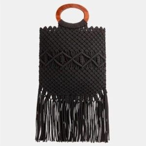 Danielle Nicole Black Fringed Macrame' Wooden Handle Shoulder Crossbody Bag