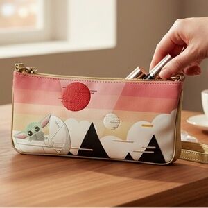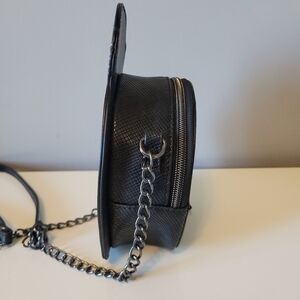 It's time you planned your escape with the Deadly Night Shade Crossbody, inspired by Disney's Nightmare Before Christmas. Featuring a zip around top closure with ghostly skull zipper pull. PU with chain crossbody strap. Front wall interior pocket.