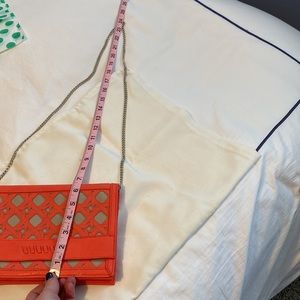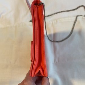 Beautiful vegan leather bag; can be carried as a clutch, shoulder or crossbody bag. Silver chain strap does not remove but can be tucked inside. Color is most accurate on the first pic, the others are photographing darker than actual.