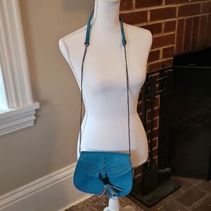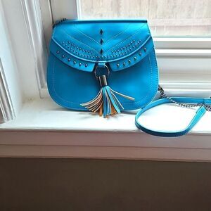 Danielle Nicole's stunning blue studded crossbody bag with tassel is a great addition to any woman's wardrobe. It has a snap close and small open inside pockets. This is in great previously owned condition.