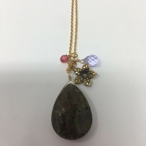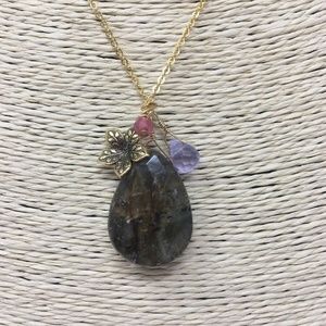 Brown Labradorite tear drop pendant with one clear tiny crystal and pink crystal and gold flower charm beside it for additional beauty.