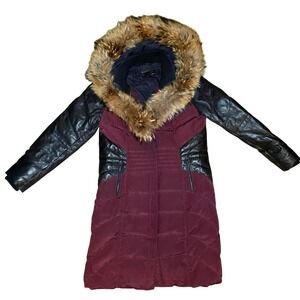 Keywords: down coat, puffer jacket, leather sleeve coat, fur hood, winter coat women, long puffer coat, quilted coat, designer coat, warm winter jacket, burgundy coat, leather jacket, fur trim coat, hooded coat
