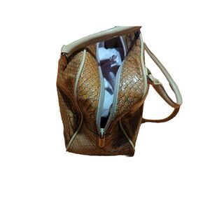 This Danier Leather Alligator Skin Purse is a stylish accessory for any occasion. The bag has a rectangular shape with a zip closure and double handles. It measures 13 inches in width, 7 inches in height, and 5 inches in depth. The exterior is made of multicolor leather with an animal print pattern, and the lining is beige polyester.
