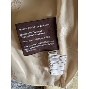 The Danier women's jacket in size L is crafted from genuine leather with an ivory color and a solid pattern. It features a stylish lapel collar, two front pockets, and a button closure. The jacket is mid-length with long sleeves, making it suitable for fall. The lining is made of 54% polyester and 46% viscose. Designed for casual occasions, this basic jacket is manufactured in Canada and requires dry cleaning. It is pre-owned. Keywords: Danier, women's jacket, leather jacket, ivory jacket, fall fashion, casual wear, mid-length jacket, button closure, lapel collar, Canadian made, pre-owned jacket, genuine leather, long sleeve, solid pattern, dry clean only.