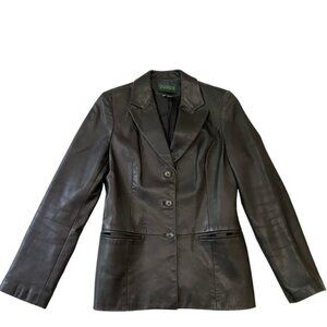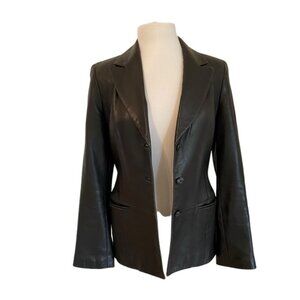 Keywords: Western country chic timeless classic career office work corporate minimalist neutral tone solid simple modern southwestern ranch blazer suede leather jacket fitted blazer pockets 3 buttons up closure small Danier distressed leather blazer fitted jacket black soft lightweight genuine