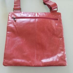 Gorgeous mauve colored distressed leather, with 23" adjustable strap. Can be worn as a shoulder, or a crossbody bag. Bag measures 12"x12".