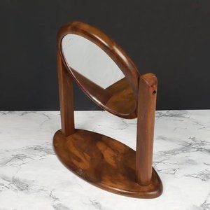 This Vintage Danish Modern vanity makeup mirror is the perfect addition to your beauty routine. Crafted with solid wood, this handmade mirror offers a double-sided usefulness with a magnifying mirror for precise makeup application and a regular mirror on the reverse. With its timeless design and quality construction, this mirror is both functional and elegant.