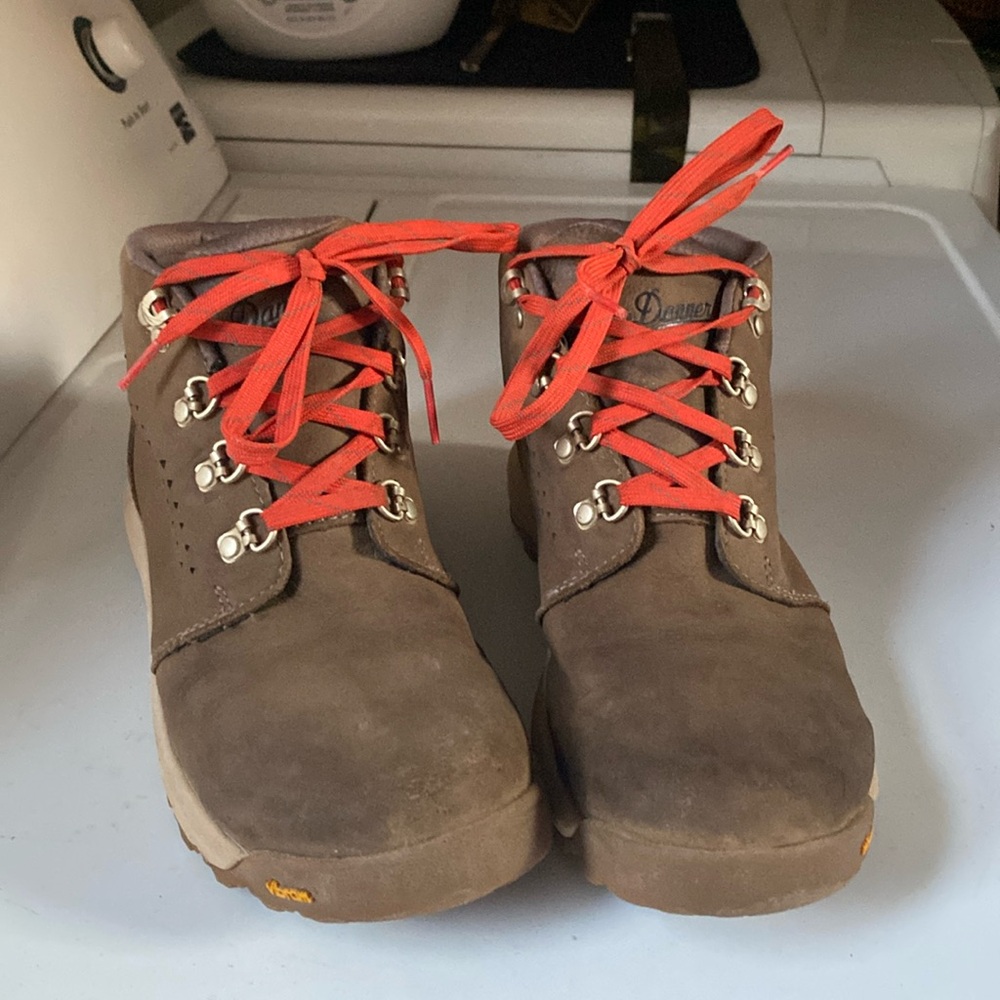 Pretty taupe color with pop of red laces these boots are amazing super comfortable and run true to size. Minor scuffs on the toes and some rub marks on the inside (see photos) besides some minor cosmetic marks these boots have only been worn a few times and have a lot of life left in them. Color no longer available on website.