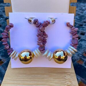Gold-tone metal with gold-tone bauble, lavender, and pearl discs. Post-back closure. Measures approx 2" in diameter.