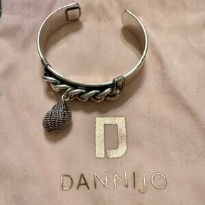 This is a Dannijo Shylo seashell charm silver tone cuff bracelet in strong preloved condition. Its inside circumference is 5.75" and it has  a .5" width.  It comes with the original pouch.