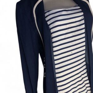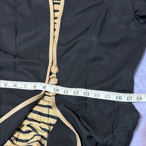 Chic black robe featuring elegant gold accents. Ideal for relaxing evenings. Enhance your loungewear with this stylish piece. pre-owned, bust measurements 41" length from shoulder to waist 18" and length from waist down 22" sleeve length 22" and waist 35", has a peak zipper below the waist in the back #p600
