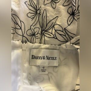 This sleeveless dress by Danny & Nicole features a striking black and white floral print, perfect for a wedding guest or cocktail event. The scoop neck and fit-and-flare style create a flattering silhouette, while the midi length adds a touch of elegance.