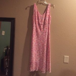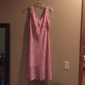 Beautiful floral print sleeveless dress with solid sweater.lined and has scallop hem.