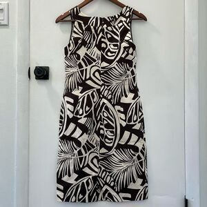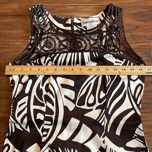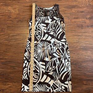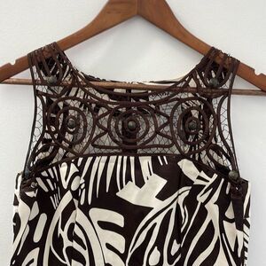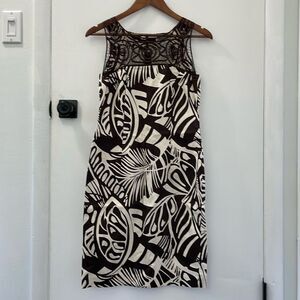 Danny & Nicole woman sleeveless dress. Perfect for warm summer nights. Excellent condition. No stains. No holes or tears. A brown laced yoke. Zip up the back. Tailored look. Form fitting. Brown/cream leaf pattern. Smoke-free home. 24 hour shipping. Open to reasonable offers.