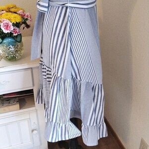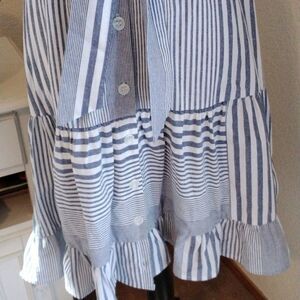 NEW Pin striped cotton dress with ruffled skirt. Tie belt. Button down front. Slightly longer in back. Size 4 measures 36 at chest, 28 at waist, 40 at hips. 38 long from shoulder to hem at front, 41 at back. Cool and comfortable for now, and NEW.