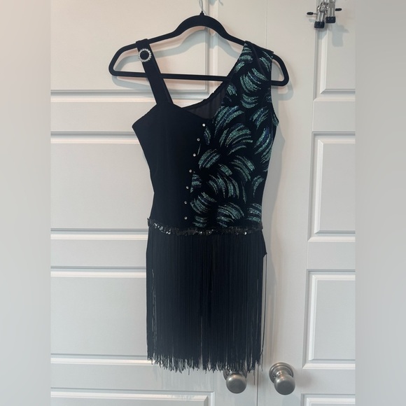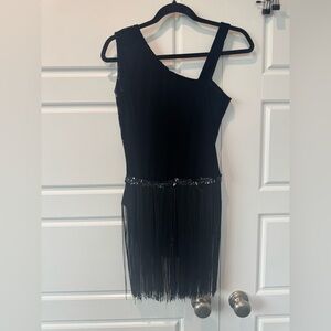 Fitted body with a velvet sparkle design, one thick should with a skinnier opposite one with a rhinestone pendant, tassel fringe skirt, full coverage bikini bottom.