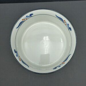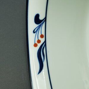 Dansk Bistro Maribro Souffle Casserole Baking Dish Serving Bowl. Excellent pre-owned condition. 8.25" x 3.75". This white ribbed round baker was made in Japan and the vintage pattern features dark blue bands and accents with red berries. (No bundling due to weight.)