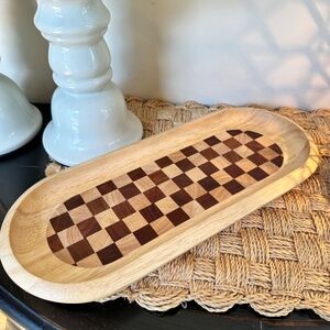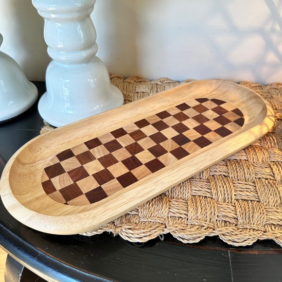 Add a touch of contemporary elegance to your home with this Dansk oval wooden checkered tray. The sleek, modern design features a beautifully crafted checkered pattern, combining warm teak with lighter wood accents for a striking look. In great, almost new condition, this tray reflects Dansk’s commitment to high-quality craftsmanship and innovative design. Founded in 1954 by Danish designer Jens Quistgaard, Dansk is known for its Scandinavian-inspired products that combine simplicity with elegance.