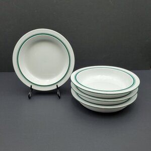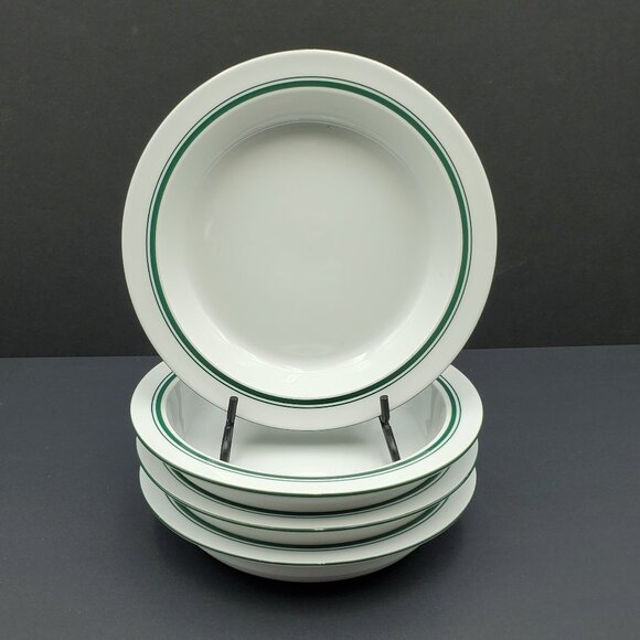 Dansk Christianshavn Green Rim Soup Bowls. Dansk Bistro Green Band Rimmed Soup Bowls - Set of 4. Excellent pre-owned condition with some light wear on the bottoms only. 8" x 1.25". These are a little on the heavy side and the price reflects my additional shipping cost. As of this posting, I have 10 available but please check with me before bundling due to weight. Thanks!