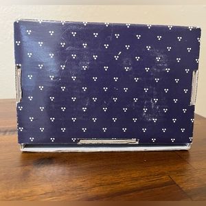 Set of four in original box, china made in Taiwan. No chips or cracks, white with blue stripes.