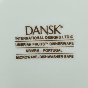 Dansk Umbrian Fruits Soup Cereal Bowls - Set of 2. Excellent pre-owned condition. 6.75" rim to rim, 2.25" tall. Colorful fruits (peaches, blueberries, strawberries, pears, blackberries, cherries) on vines with a tan basketweave pattern on the rim.