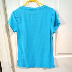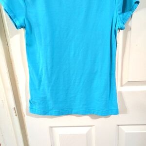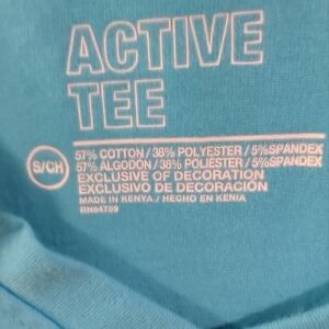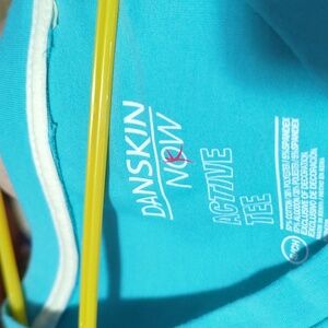 Elevate your activewear wardrobe with this Danskin Now Active Tee in size small. The turquoise and white V-neck T-shirt features a slim fit and short sleeves, perfect for school or yoga. The breathable and lightweight cotton, polyester, and spandex blend is easy to care for and machine washable.