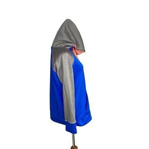 Danskin Now Athletic Hoodie. Size Large (12-14). In good condition. Blue, grey, and neon coral orange. Drawstring hood. Kangaroo Pouch. Pull over.