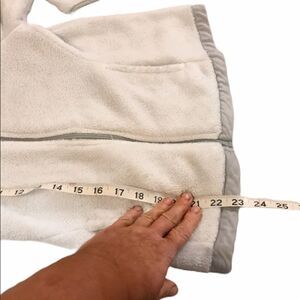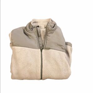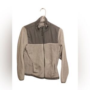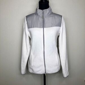 Danskin Now jacket in gray and white. This jacket is soft and features two front pockets and a zipper closure. Made of 100% polyester. Machine wash cold and tumble dry low.