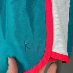 Stylish Danskin Now athletic shorts. Teal body with white sides. Pink trim adds a pop of color. Perfect for workouts.