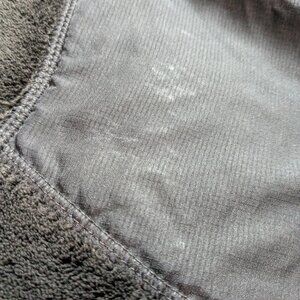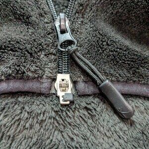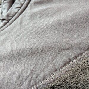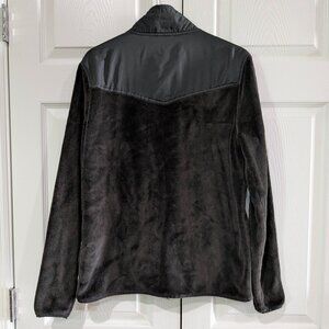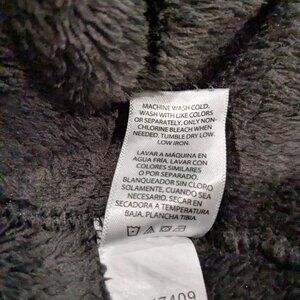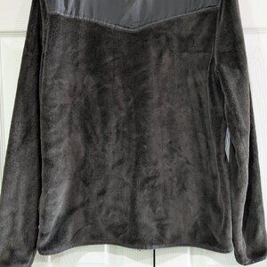 Danskin Now women's fleece jacket in black soot with silky black panels on the shoulders. Features a full front two-way zipper (bottom zipper missing its pull as shown in photo), long sleeves, elastic at cuffs and hem, two front pockets, and two inside pockets. Made from soft, cozy, warm 100% polyester. Machine washable. Pre-owned with some discoloration on the silky chest area and a faded logo on the back as shown in photos. Measures approximately 23" armpit to armpit, 26" from center back of neck to hem, collar rise adds 2.5", and 25" sleeve from shoulder seam to cuff.