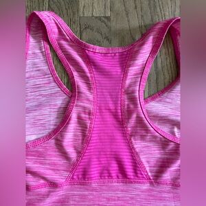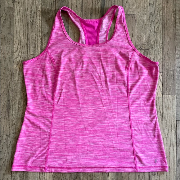 Vibrant pink tank top with racerback design. Ideal for active or casual wear.