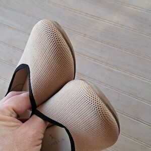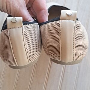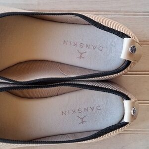 A beautiful neutral color Danskin Women's Soulful Slip On Flats in beige, tan, light brown with black trim.