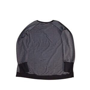 Danskin offers a comfortable and classic striped T-shirt for women's activewear or casual occasions. The black and white top is made of a blended fabric of polyester and spandex, which is breathable and suitable for all seasons. It features a crew neck, long sleeves with thumbholes, and a pullover style. The faux wrap tee is available in size L and fits regularly.