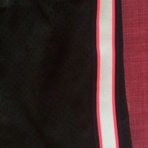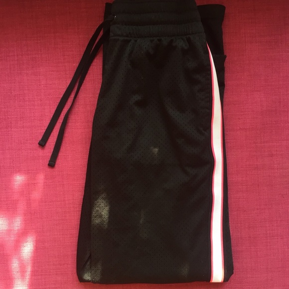 Black with a pink & white strip on both sides of legs. Very comfy and great for exercising in. Size: small w/ lots of room.