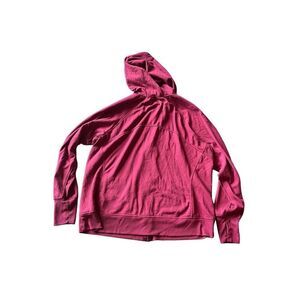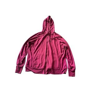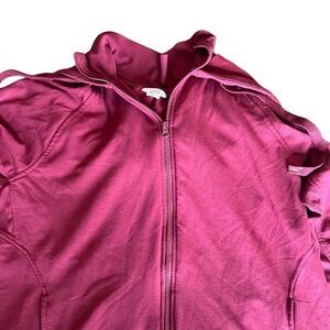 Maroon full zip hoodie sweatshirt when hood is down there is an interior collar, see photo. Full zip, with 2 front pockets.