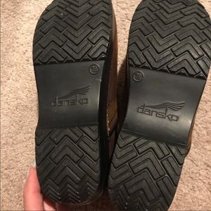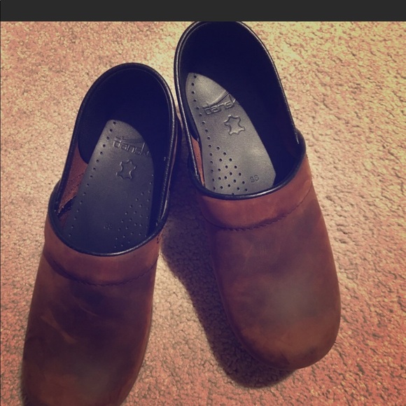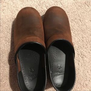 Brown leather danskos. 2 very small scratches on the leather in the back of the shoe. These shoes have only been worn once.