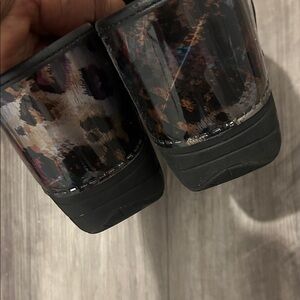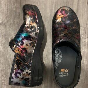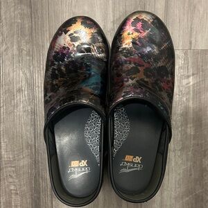 Eye-catching Dansko XP 2.0 clogs with a unique artistic design. Perfect for a bold fashion statement. Animal print.