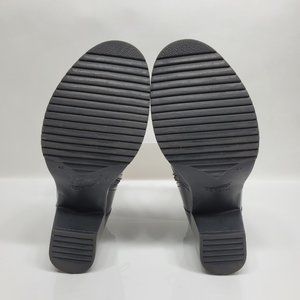 These Dansko combat boots feature a sleek black leather-like exterior with a robust, chunky heel for added comfort and stability. The lace-up design offers a classic moto boot silhouette, perfect for both fashion-forward and functional wear. With a durable rubber sole and rounded toe, these boots are designed for versatility and long-lasting wear. Beautiful boots, but I got two pair when I bought these and only need one.