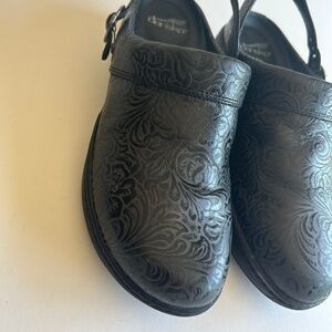 Dansko Black Grey Leather Clogs Sandals size EUR 40, US 9.5. Heel 1.5”, platform 0.5”. In great condition, no signs of wear, gently worn a few times.